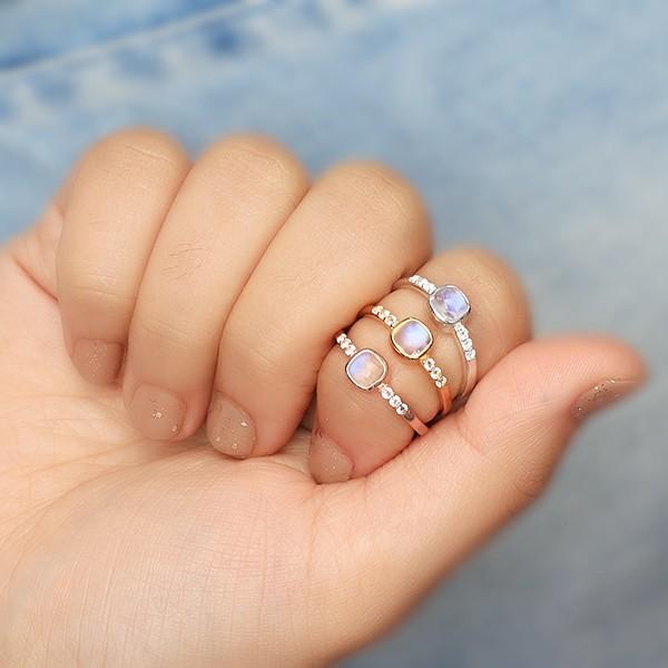 This is the petite gold moonstone ring that has two cubic zirconia gems accompanying the moonstone and enhancing it's shine even more. The minimal design speaks of moonstone's simple & calming nature.