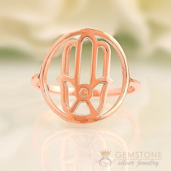 This hand of Fatima good karma chakra ring is a stunning sterling silver ring overlaid with rose gold. It's design speaks of the 'hamsa' sign of good luck from many eastern cultures. Not only that, this design can be the unique piece of your jewelry box.