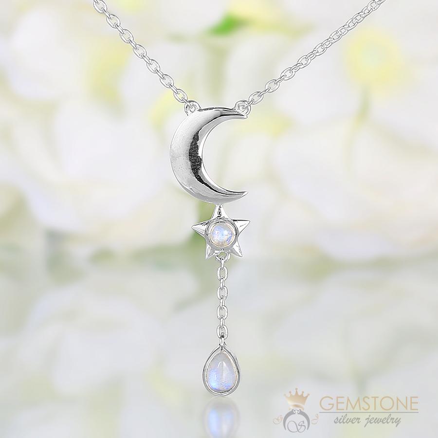 For a confident woman of today, this moonstone necklace is completely synonymous to their creative flair in fashion. It features a crescent moon, a moonstone star, and a swaying moon drop dangling below the star. All of this is combined with sterling silver for a strong build and presented in a charming manner for an amiable appearance. Wear this necklace once and you will want to keep wearing it always. Adjustable Necklace Chain Length 16" |