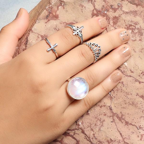This state-of-the-art moonstone silver ring combines healing touch of this exceptional gem and strength provided by sterling silver to make the perfect round ring you have been looking for all this time. This is a no-complexity design with the stone set in silver by hand.