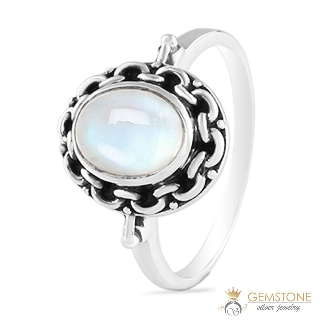 You will look and look but you will never find exquisite art combined with a luminescent moonstone in such a brilliant manner. This is a ring that defines class with it's rustic charm and use of sterling silver that lasts more than pure silver. It is a piece that you will adore and get all that adoration back from the moonstone because of it's remarkable motherly and nurturing qualities.