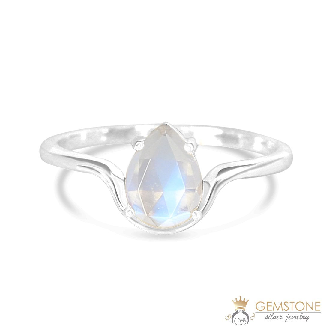 The teardrop shaped moonstone is carefully placed on sterling silver band to give it a shimmering gloss while four prongs hold it in place. It is a moonstone silver ring that you will never want to take off.
