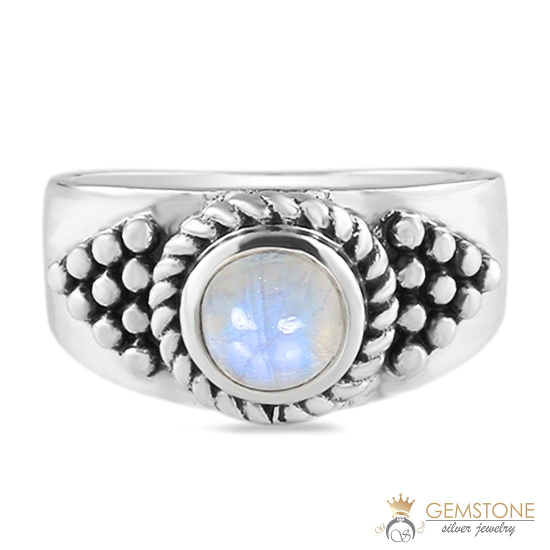 This rainbow moonstone ring has a thick sterling silver band that gives it the strength to make it last longer than delicate rings and also lets it double as a thumb ring.