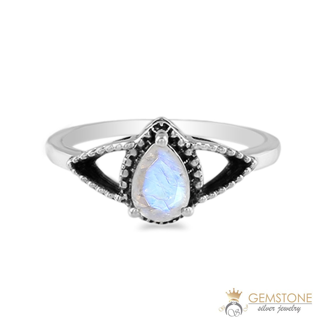 Another one from our aristocratic collection, this is a ring that has been the favorite of the designers. It features a moonstone cut in the classical drop/pear shape with a trendy and chic design of the ring. The way moonstone has been cut makes it shine in various shades of blue and purple at the same time when held against light. This characteristic is known as adularescence and it is only seen in moonstone.