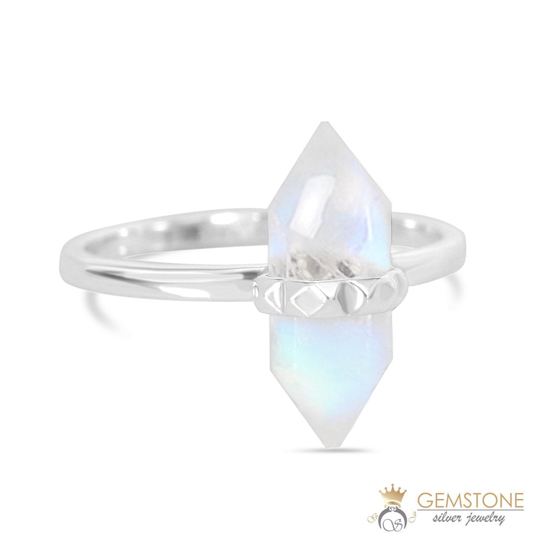 This 925 sterling silver ring has been created for the love of crystals by using the king of crystals in an almost natural-looking form. The blue moonstone is held by silver, forming a ring around it.